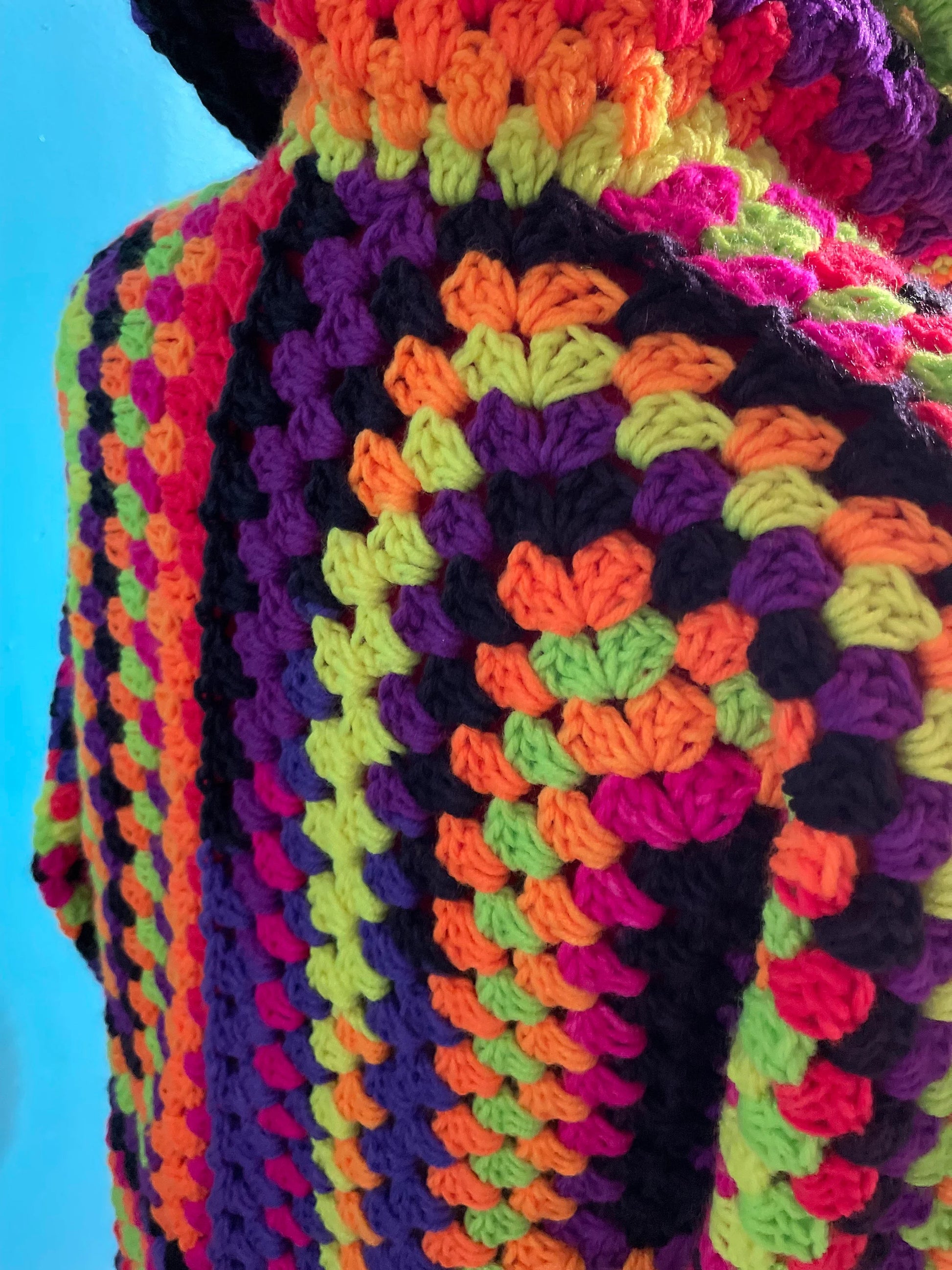 Looking for a cozy and colorful way to show your Pride? Check out this handmade long hooded cardigan in bright rainbow colors! This cardigan is perfect for chilly days, snuggling on the couch, or going out with friends. It's made of durable and washable acrylic yarn, so you don't have to worry about stains or shrinking. Plus, it has a generous hood and long sleeves to keep you warm and comfy. Whether you want to celebrate your identity, support the LGBTQ+ community, or just love bright color, this cardigan is a must-have for your wardrobe!