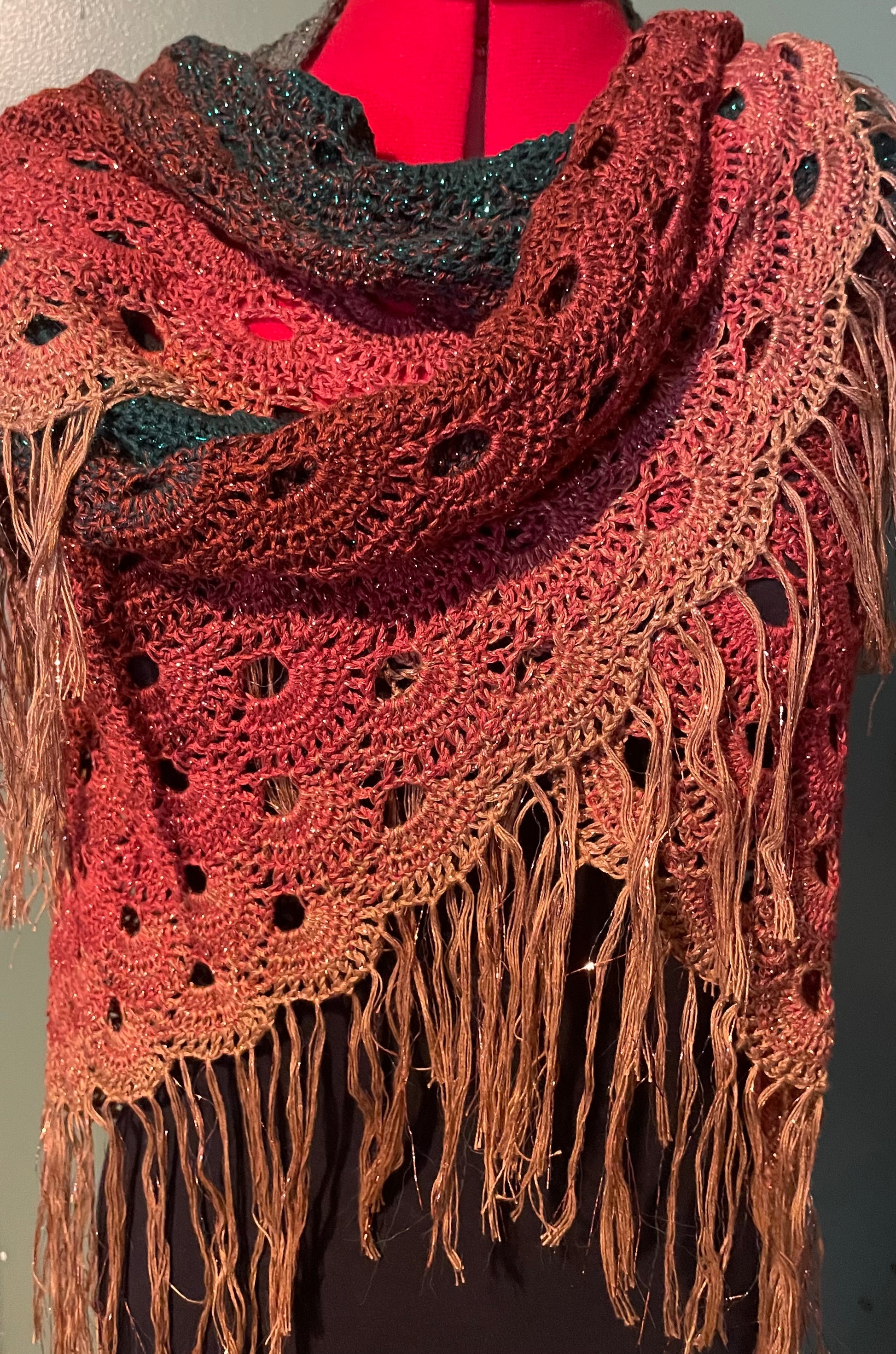 Hand-crocheted triangle shawl made with holidays in mind, with rich Christmas-inspired hues, a touch of glittering New Years lurex, and flowing fringe.